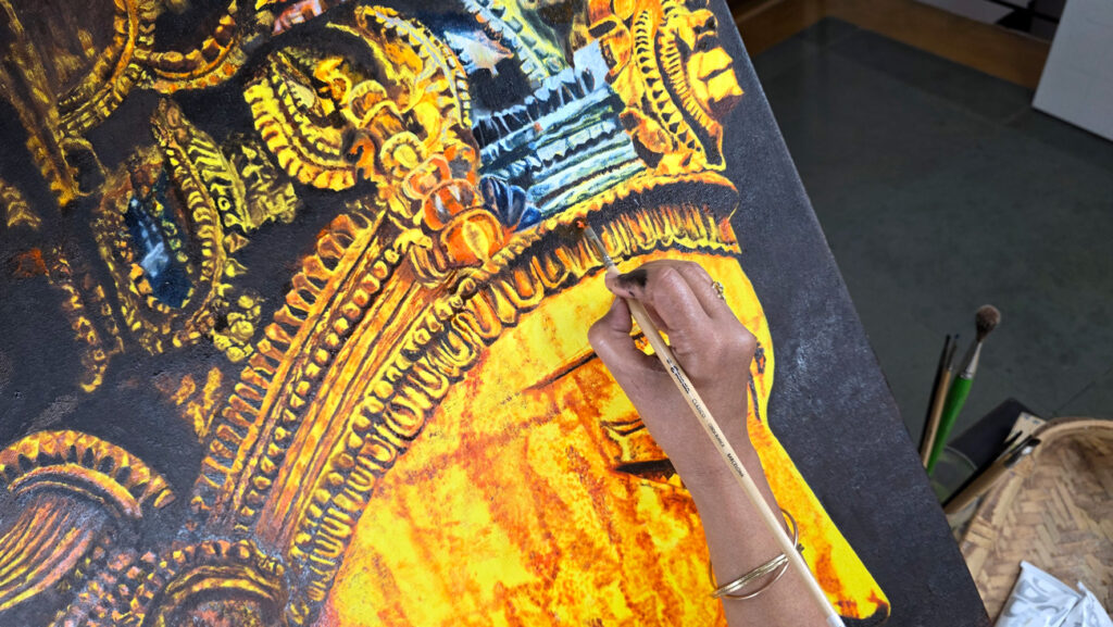 But when I look at Seemanthini’s works of art, it gives me a sense of reformation of ancient Indian art. Her paintings have deep meaning and substance. Very consistently, in a deliberate reconstructive form, she translates ancient Indian art to somehow give it life with intricacy. I would consider her remodelled dimension of ancient Indian art to be a Reconstruction of Realism school of art. She is the only person to have established a path-breaking school of thought on ancient Indian art. And she is consistent in her works of art.