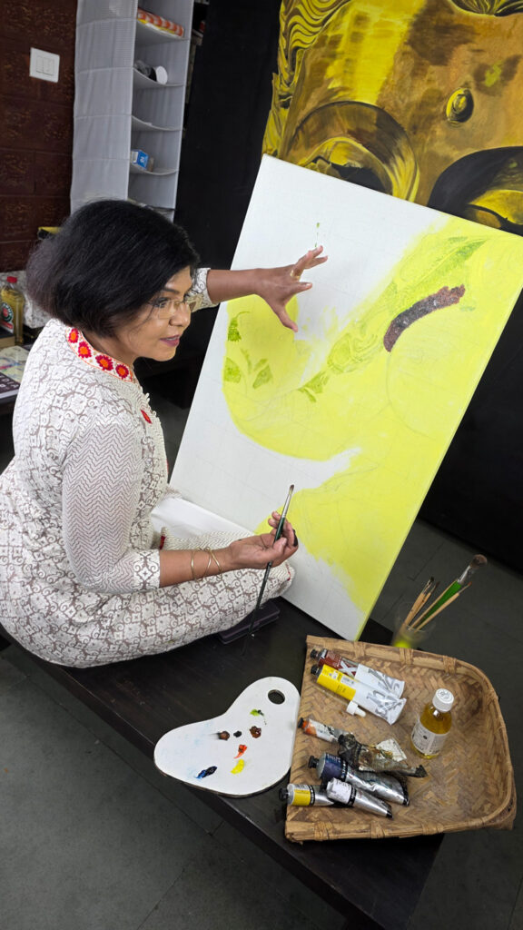 Art is in her blood and mind. She started painting from an early age. During her medical science studies, she did not abandon her passion for painting. She has masterminded her own artistry in a spectacular way which is undoubtedly touching the core of ancient Indian style of art in contemporary interpretation.